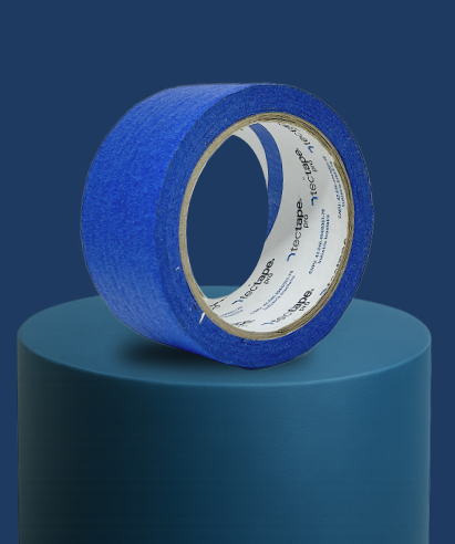 Fita de papel crepe com adesivo de borracha e resina, resistente à luz UV por até 7 dias e removível sem deixar resíduos.